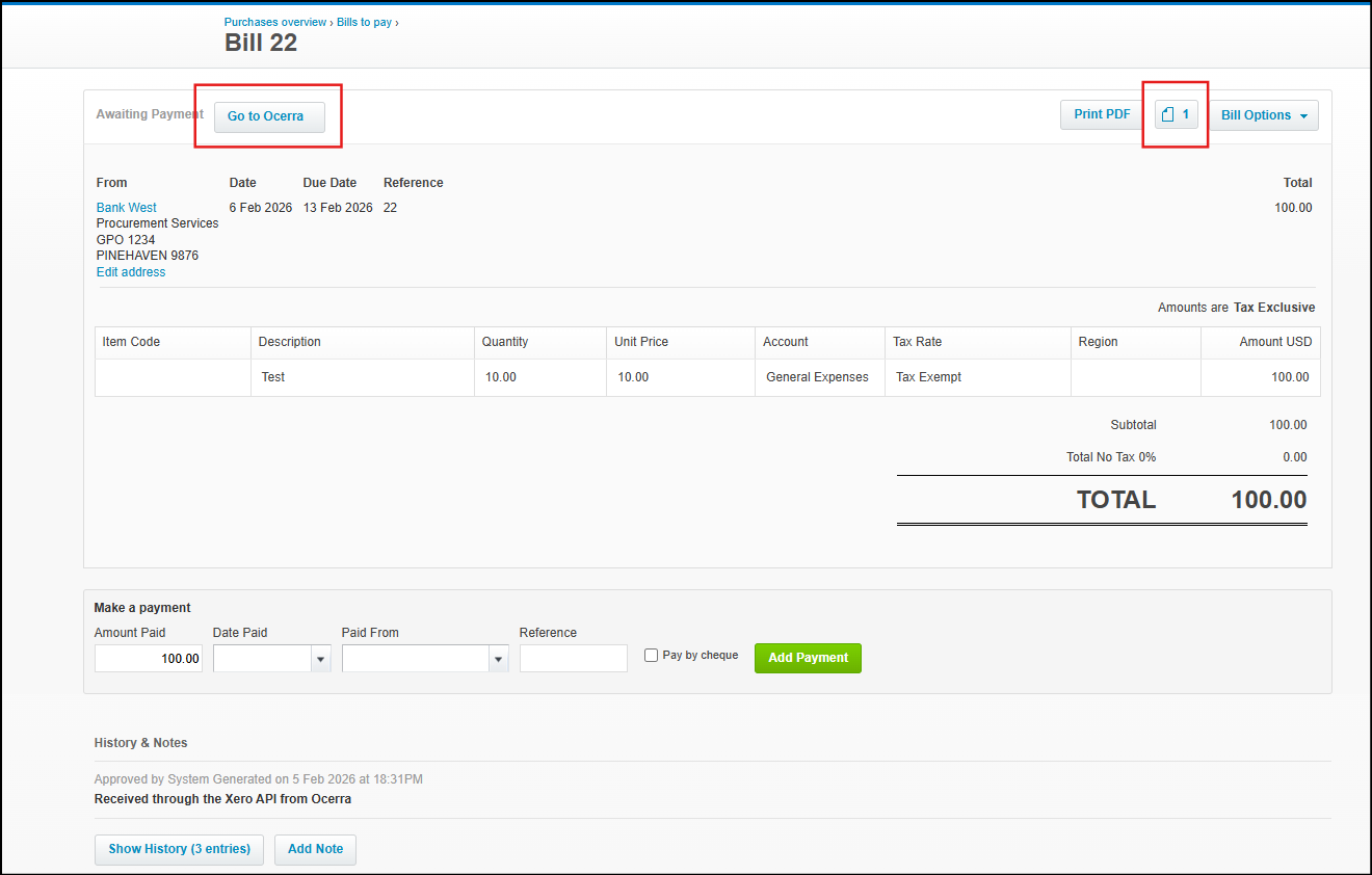 Ocerra is connected with Xero, this allows instant export of AP bills from one system to another. Ocerra will create a new purchase bills with the original PDF attached to it.
