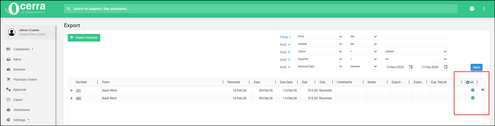 Invoices exported while in “Received” status will appear in Draft status in Xero.