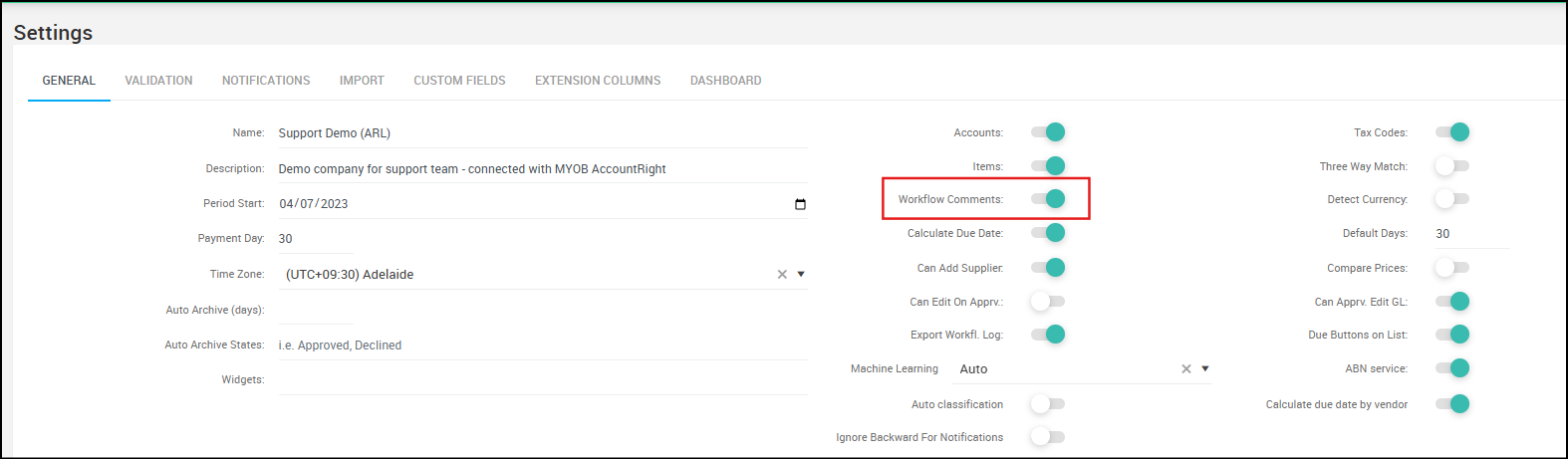 When enabled, the workflow comments columns will be visible on the Invoice page too: