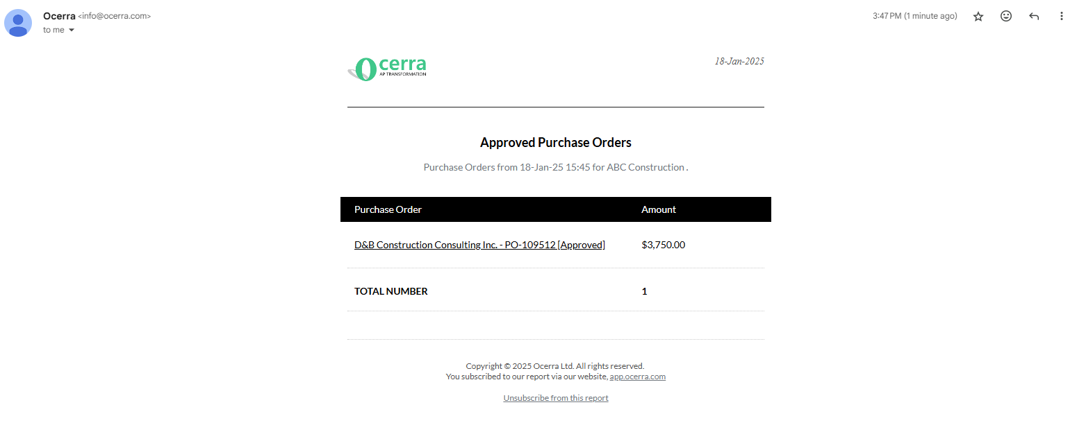Email notifications for purchase orders help streamline communication between purchasers and approvers, ensuring everyone stays informed during the approval process. These notifications are sent in batches once per day at a scheduled time, making it easy to manage approvals without overwhelming users.
