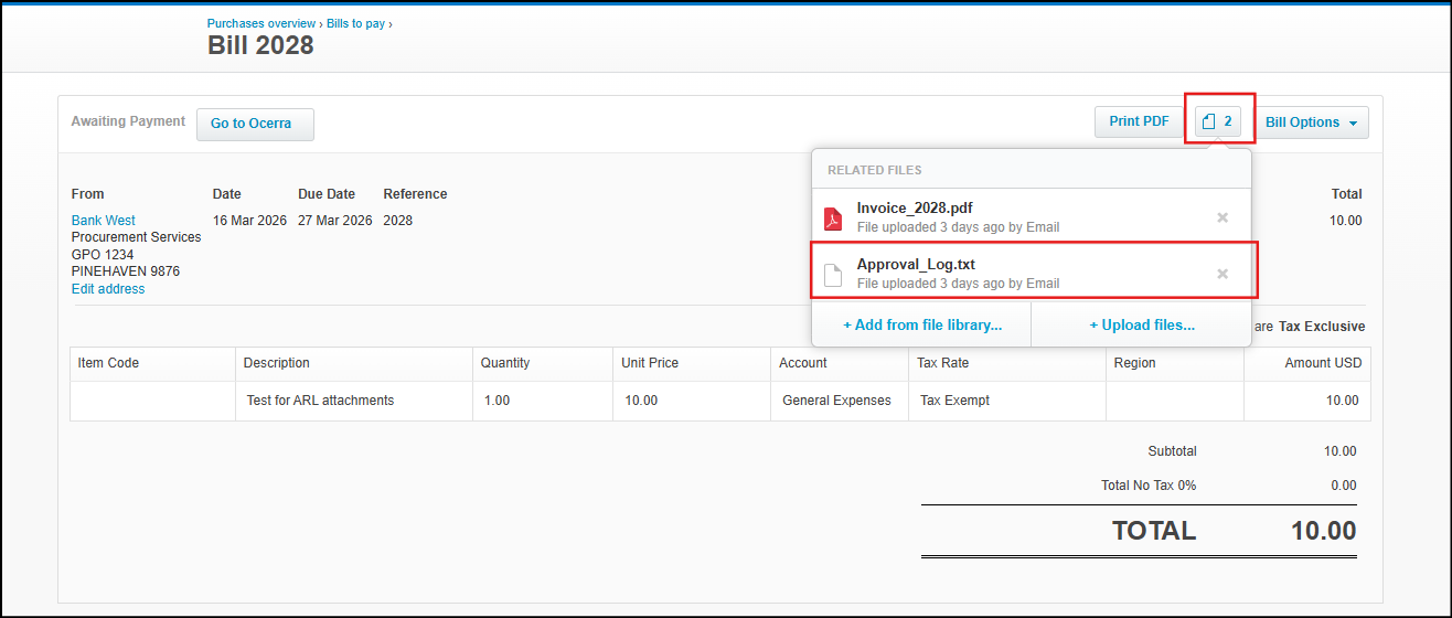 When enabled, the approval log is included as a text file along with the invoice PDF or copy for each exported invoice or credit note. This log contains essential approval details such as approvers and timestamps, enhancing visibility and supporting audit tracking directly within Xero.
